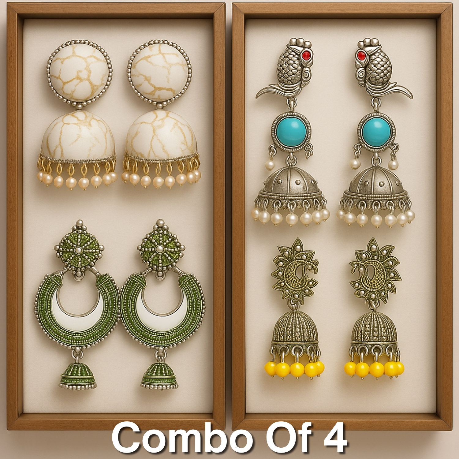 Four statement jhumkas in one box: ivory-gold marble, parrot top with blue stone, mehendi-green crescent, and antique peacock with yellow beads. Festive, photo-ready, and effortlessly stylish.