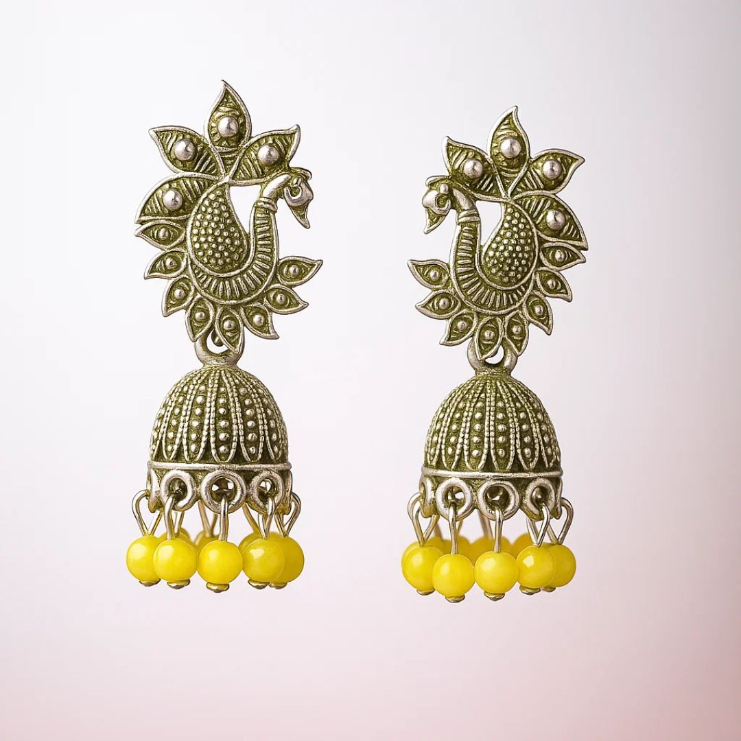 Antique Peacock Jhumka – engraved dome + yellow bead fringe